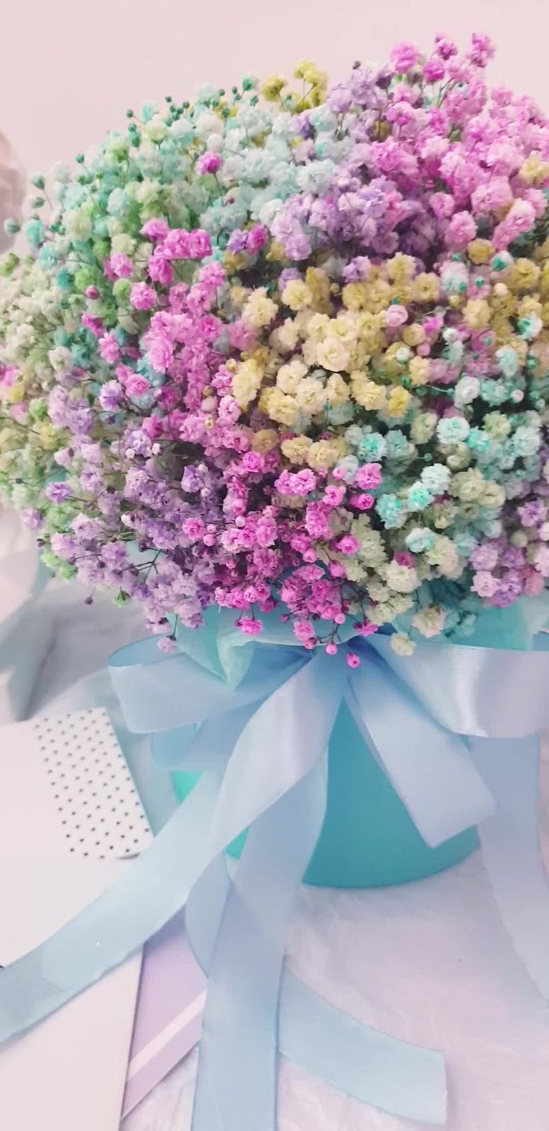 Лента атласная – 1 шт.Коробка шляпная – 1 шт.Открыточка с вашими пожеланиями – 1 шт.Оазис флористический – 1 шт.гипсофила радужная – 7 шт.