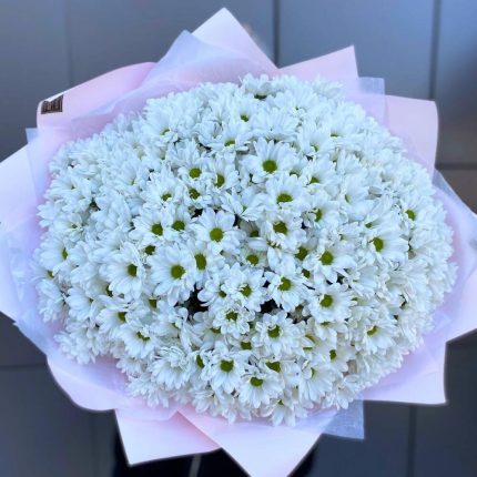 Букет из 5 веток ромашковых хризантем в дизайнерском оформлении, количество ромашек в букете может достигать 51 штуки .