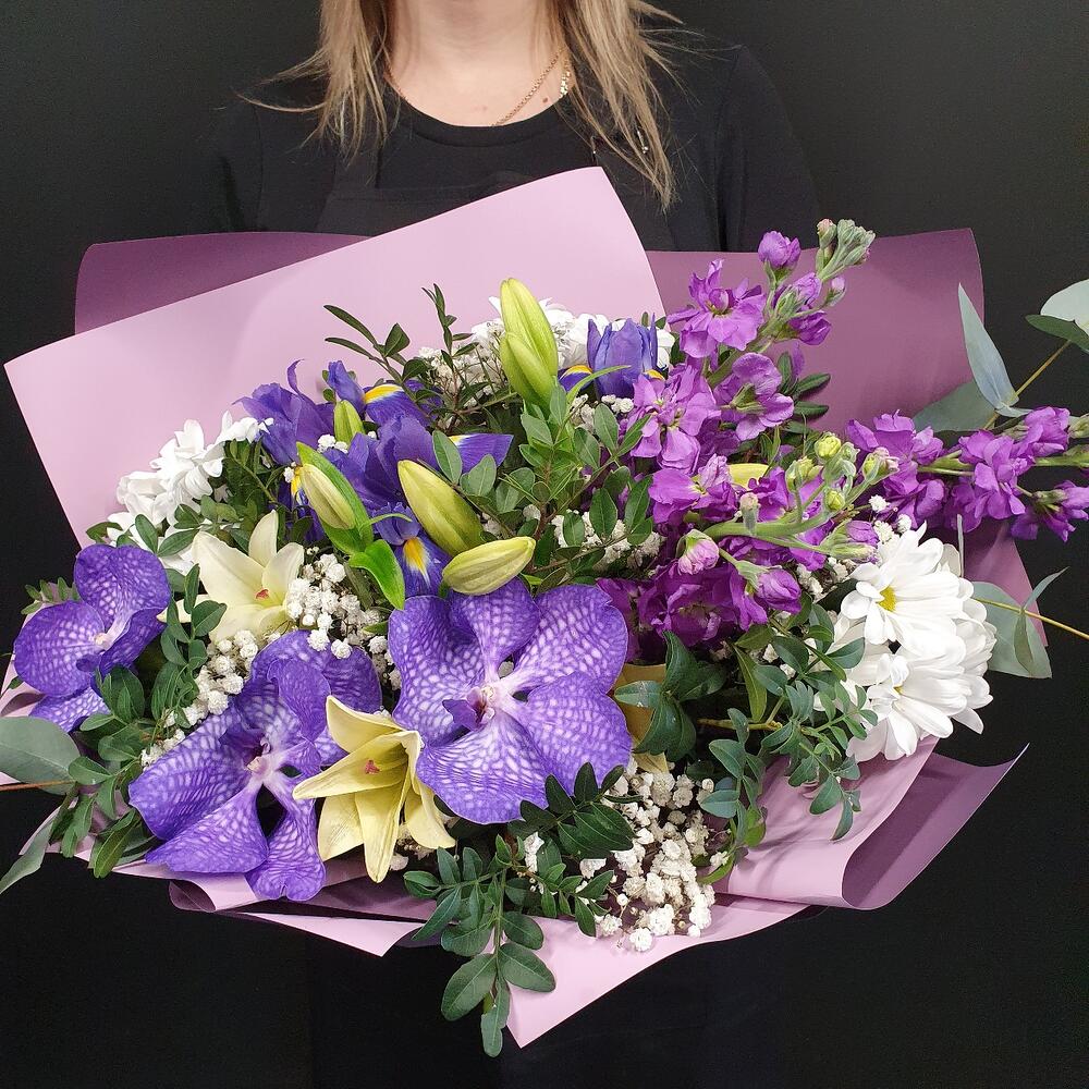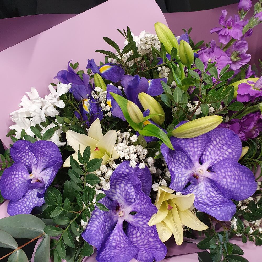 Азиатская лилия – 2 шт.Ирис – 3 шт.Гипсофила – 2 шт.Хризантема кустовая – 3 шт.Орхидея Ванда – 3 шт.Маттиола – 3 шт.Эвкалипт – 2 шт.Фисташка – 6 шт.Упаковка дизайнерская – 2 шт.