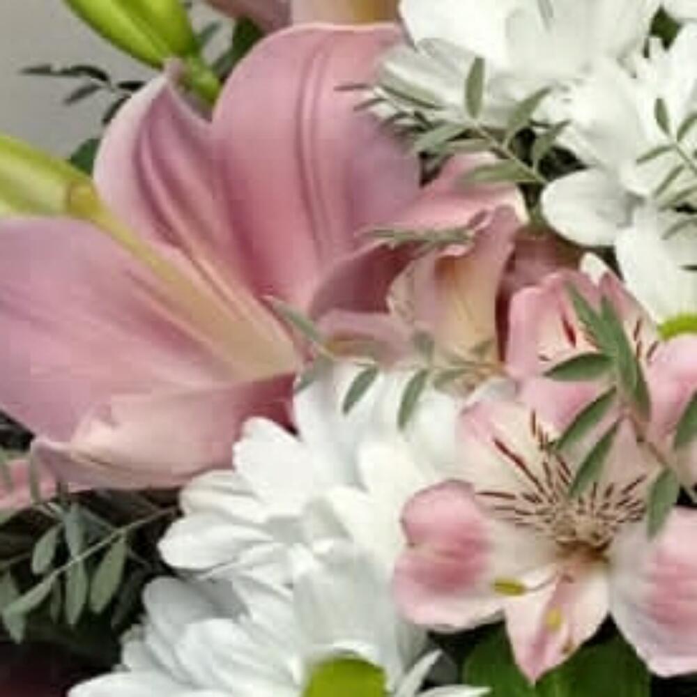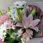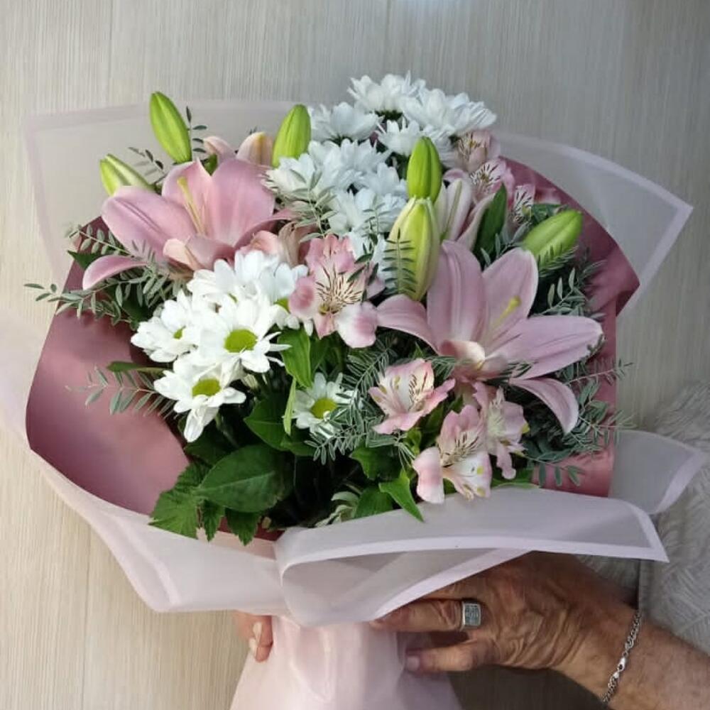 Лилия розовая – 2 шт. Хризантема кустовая ромашковая – 3 шт. Альстромерия Микс Европа – 4 шт.