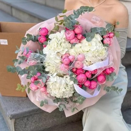 Букет "Sylvie" с гортензией, пионовидной розой и эвкалиптом