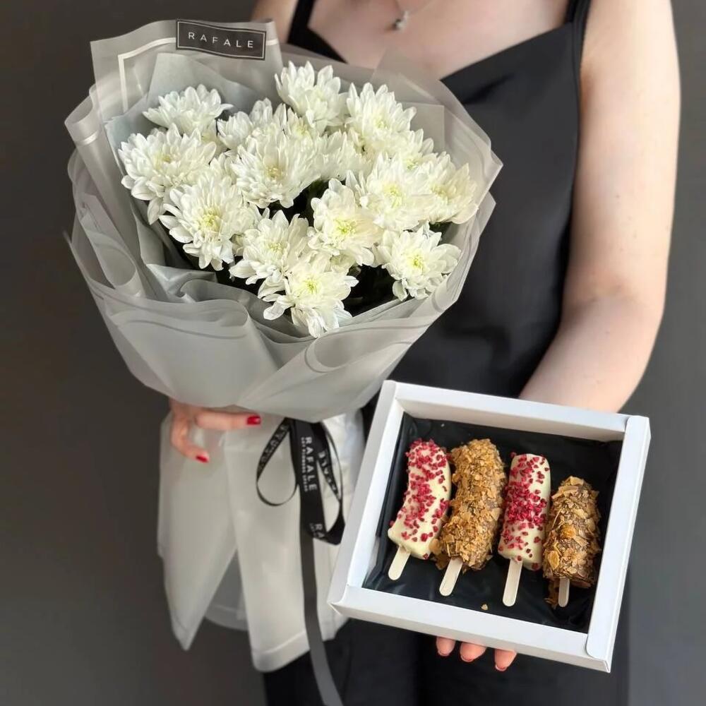 Прекрасный дуэт из бананов в шоколаде и букета хризантем, чтобы порадовать своего близкого человека.