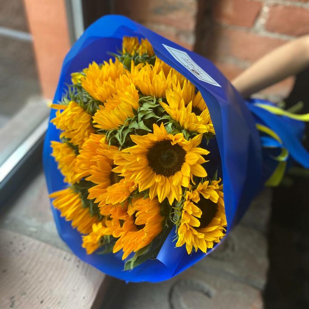 Букет из 15 подсолнухов в стильной упаковке “Пламенное солнце”