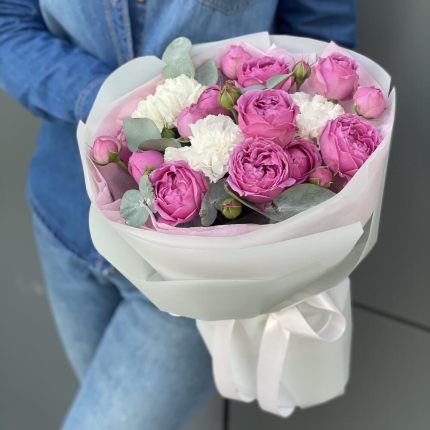 Букет Лилас из кустовых пионовидных роз и диантуса