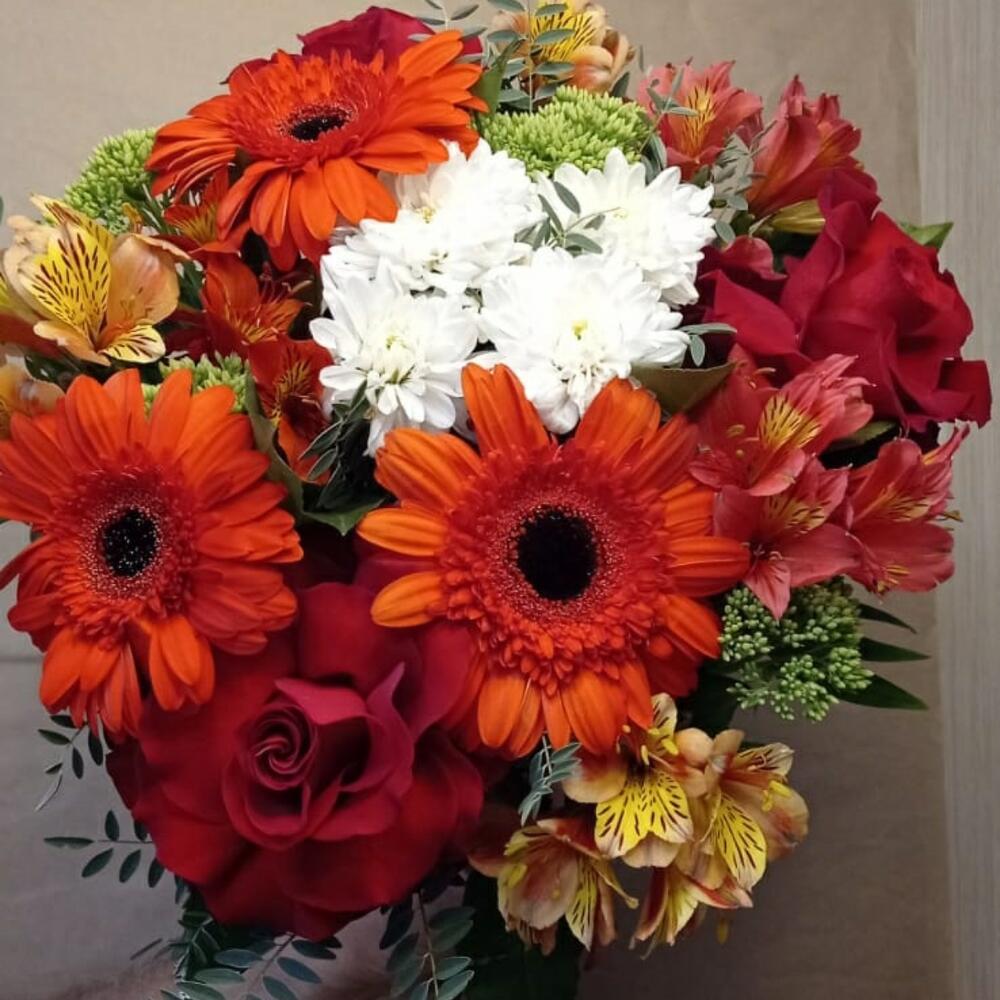 Альстромерия – 5 шт. Роза красная – 3 шт. Хризантема кустовая белая – 1 шт. Гербера красная – 3 шт.