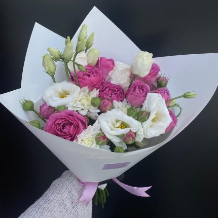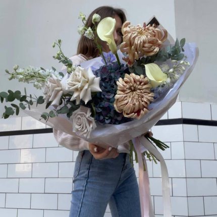 Лизиантус – 3 шт. Кустовая роза – 3 шт. Хризантема кустовая – 3 шт. Гладиолус – 3 шт. Упаковка дизайнерская – 3 шт. Открыточка с вашими пожеланиями – 1 шт.