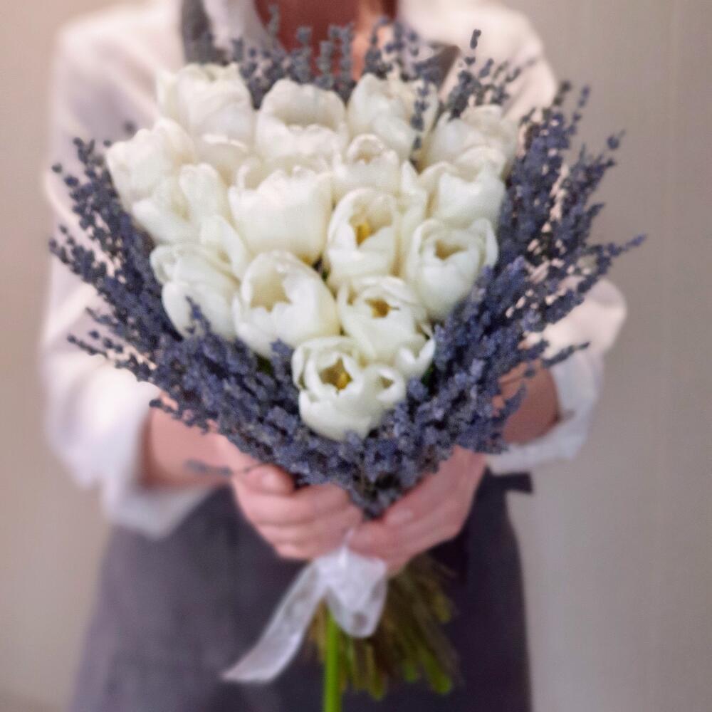 Лаванда (сухоцвет) – 150 гр.Лента органза – 1 шт.Открыточка с вашими пожеланиями – 1 шт.Шпагат джутовый – 1 шт.тюльпаны белые голландия – 15 шт.любовь флориста (бесплатно) – 1 шт.