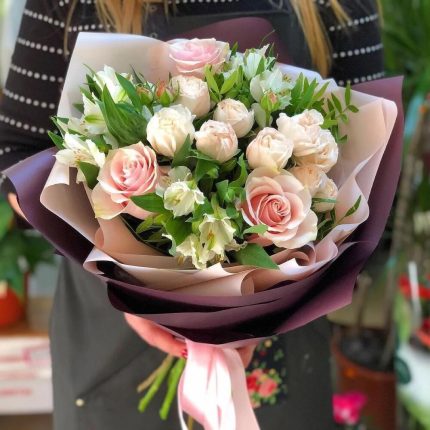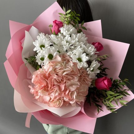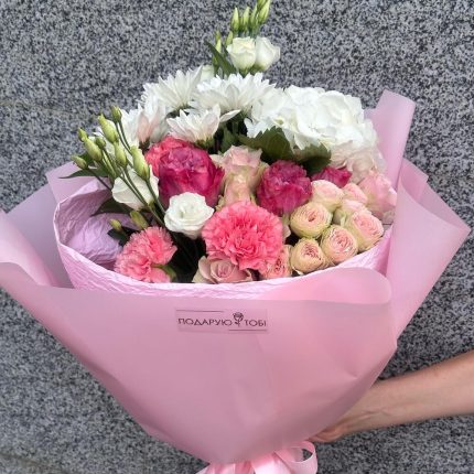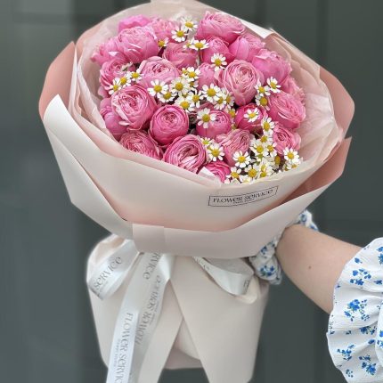 Букет Лучшее Признание S из танацетума и кустовой пионовидной розы сильвиа пинк